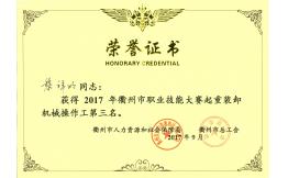 我司員工黎祥明獲得2017年衢州市職業技能大賽起重裝卸機械操作工第三名