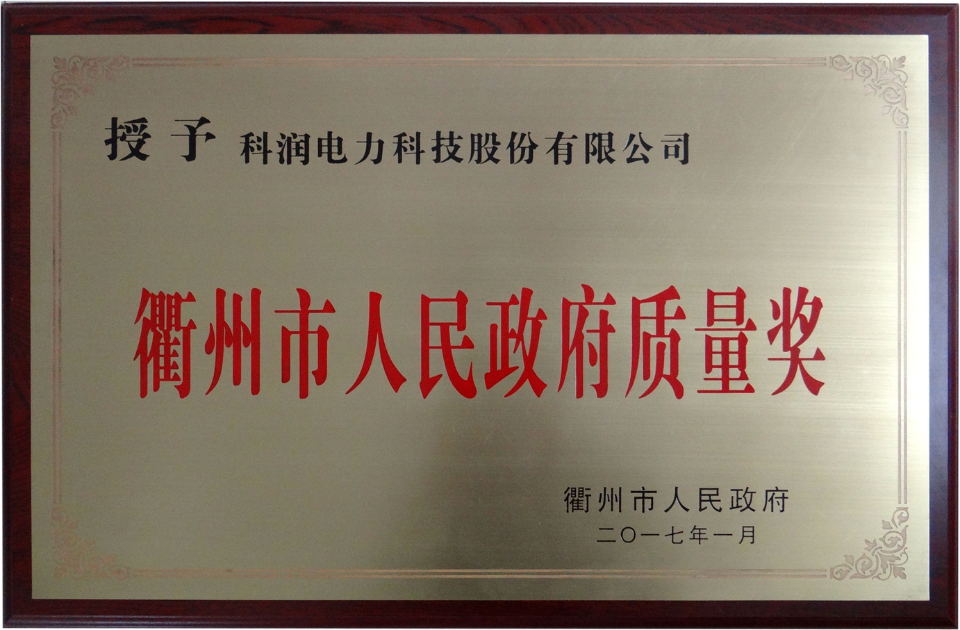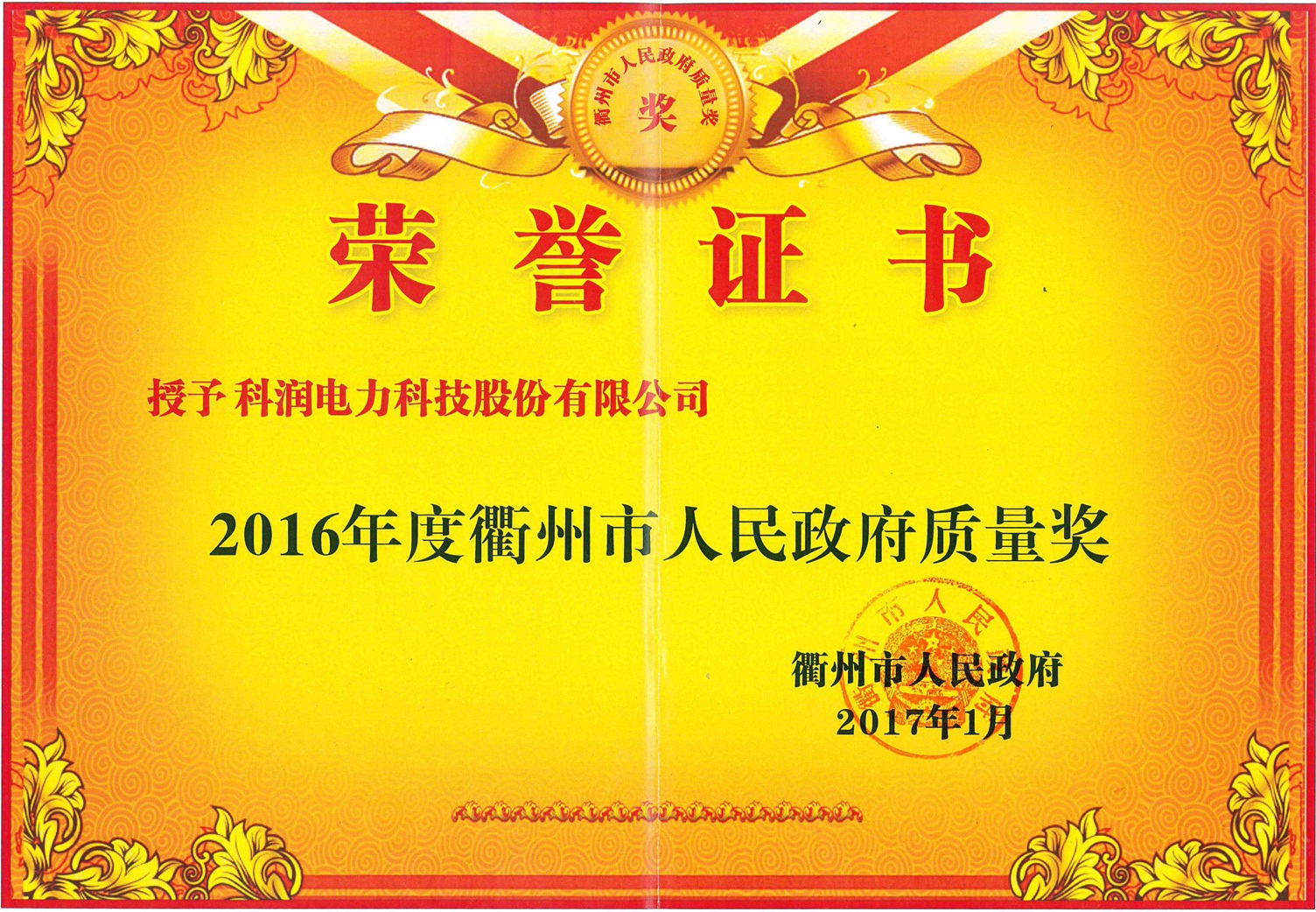 2017年1月24日,公司獲評“衢州市人民政府質量獎”。