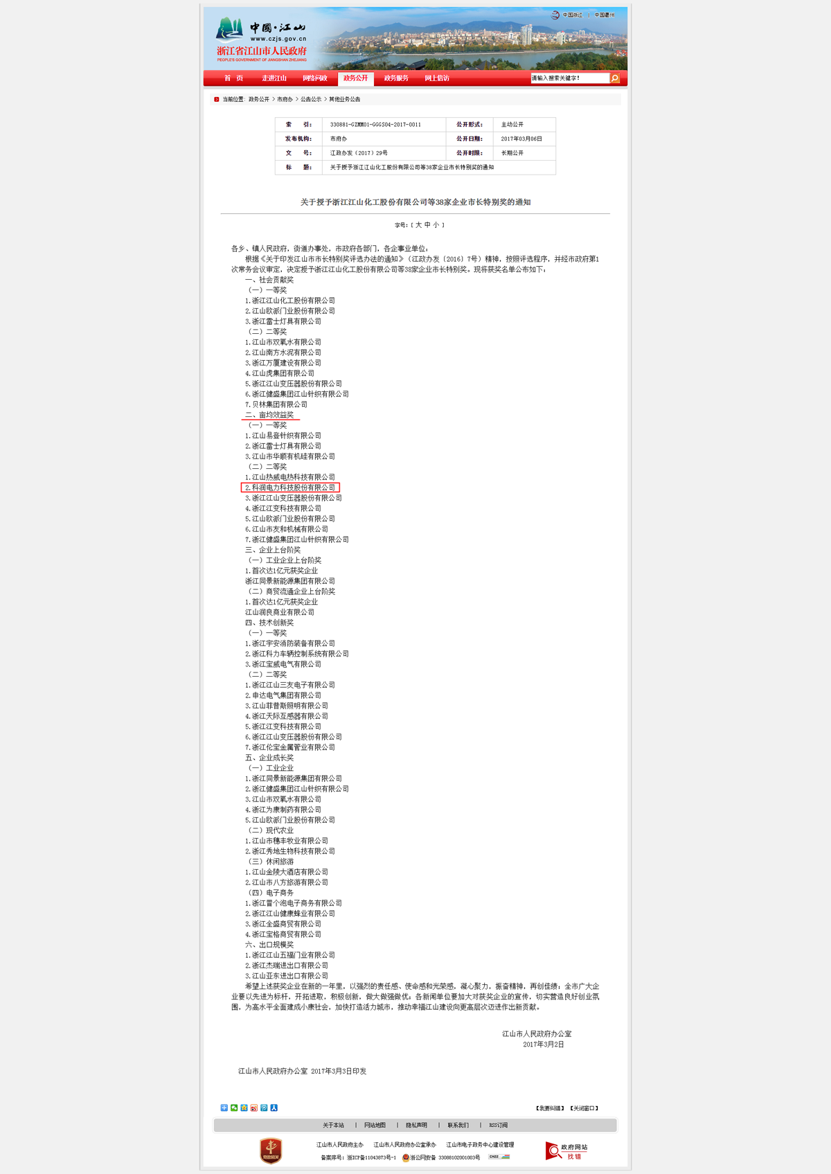 喜訊:科潤電力榮獲江山市市長特別獎——畝均效益獎二等獎