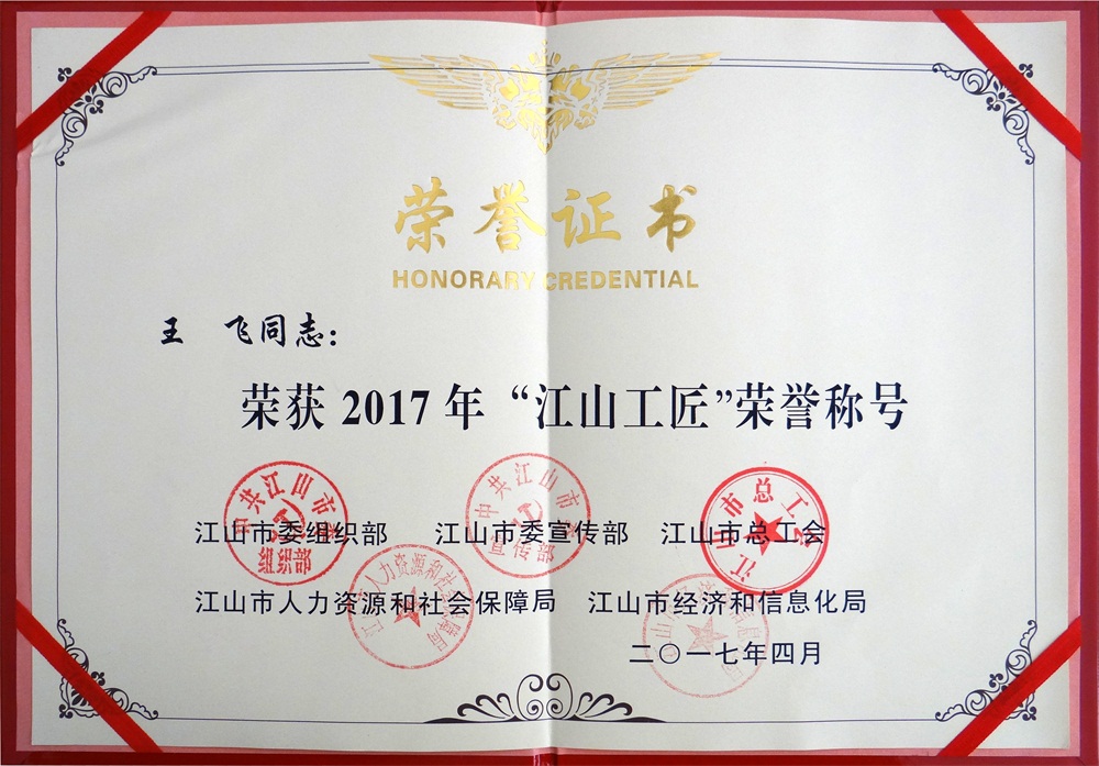 喜訊:我司員工王飛榮獲“江山工匠”榮譽稱號