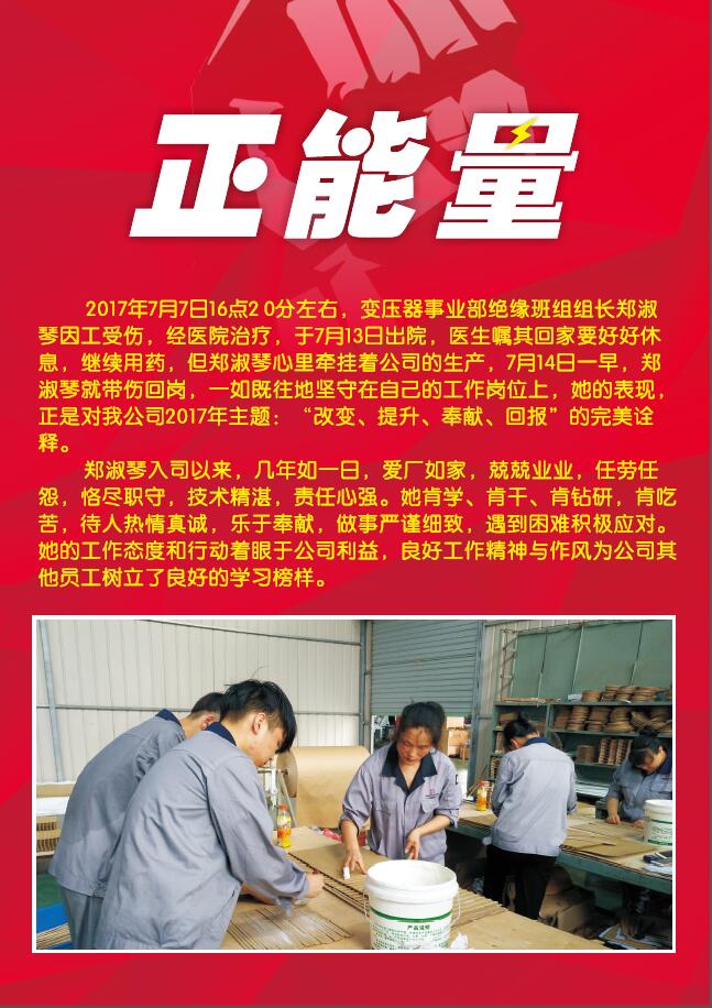 2017年7月7日16點2 0分左右,變壓器事業部絕緣班組組長鄭淑琴因工受傷,經醫院治療,于7月13日出院,醫生囑其回家要好好休息,繼續用藥,但鄭淑琴心里牽掛著公司的生產,7月14日一早,鄭淑琴就帶傷回崗,一如既往地堅守在自己的工作崗位上,她的表現,正是對我公司2017年主題:“改變、提升、奉獻、回報”的完美詮釋。