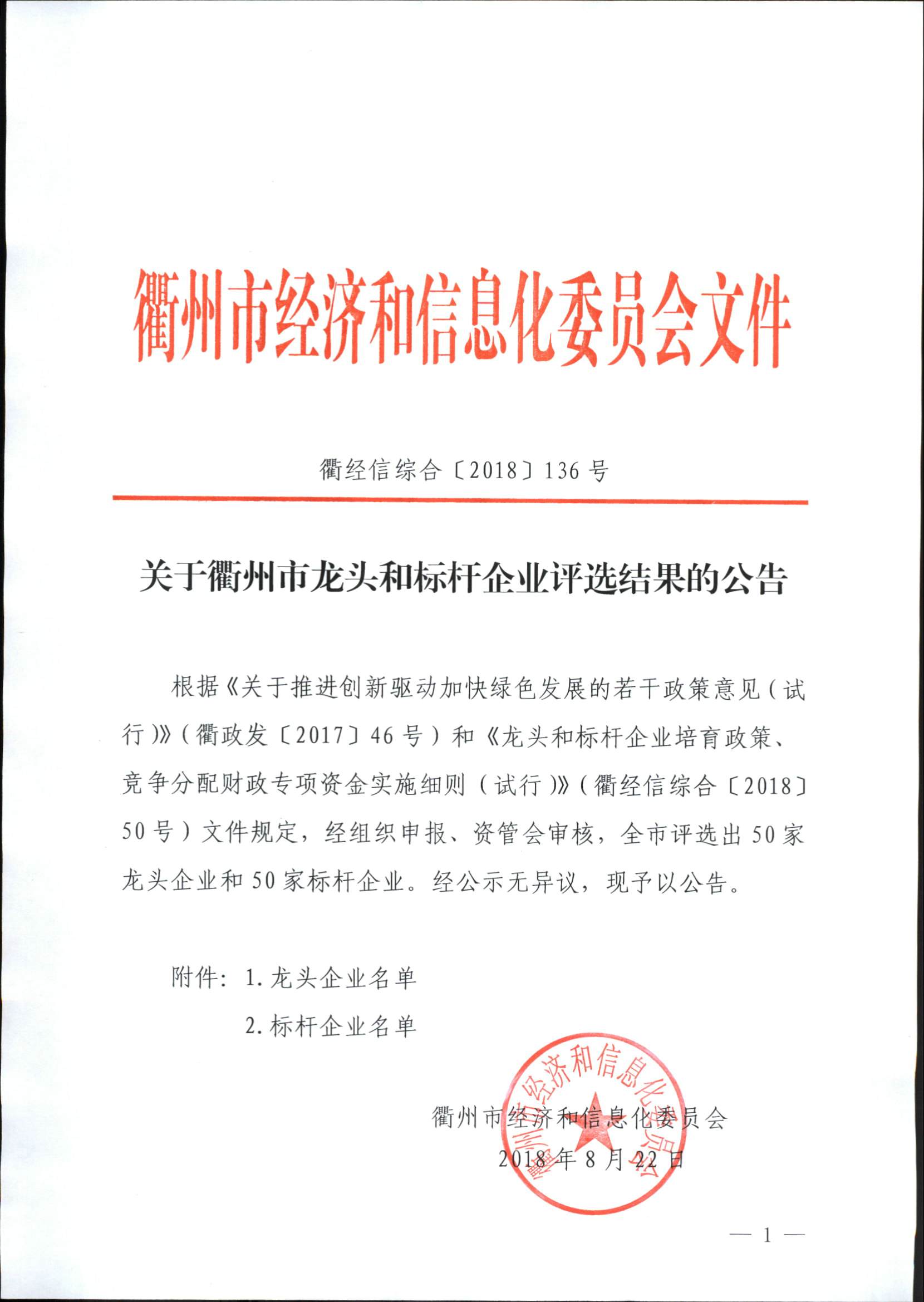 近日,衢州市龍頭和標(biāo)桿企業(yè)評選結(jié)果出爐,我司喜獲殊榮,榜上有名。