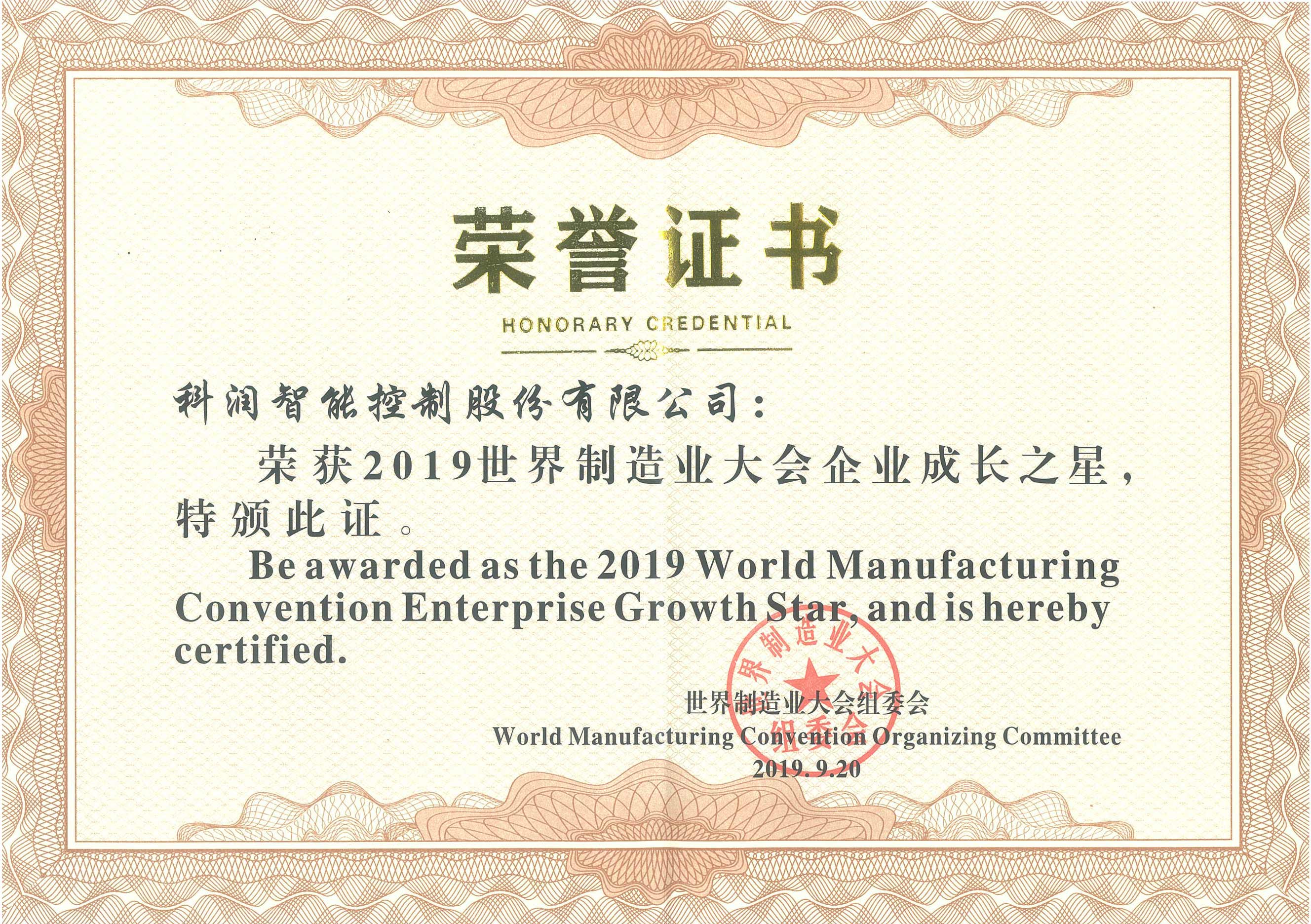 我司榮獲2019世界制造業大會 “企業成長之星” 榮譽稱號