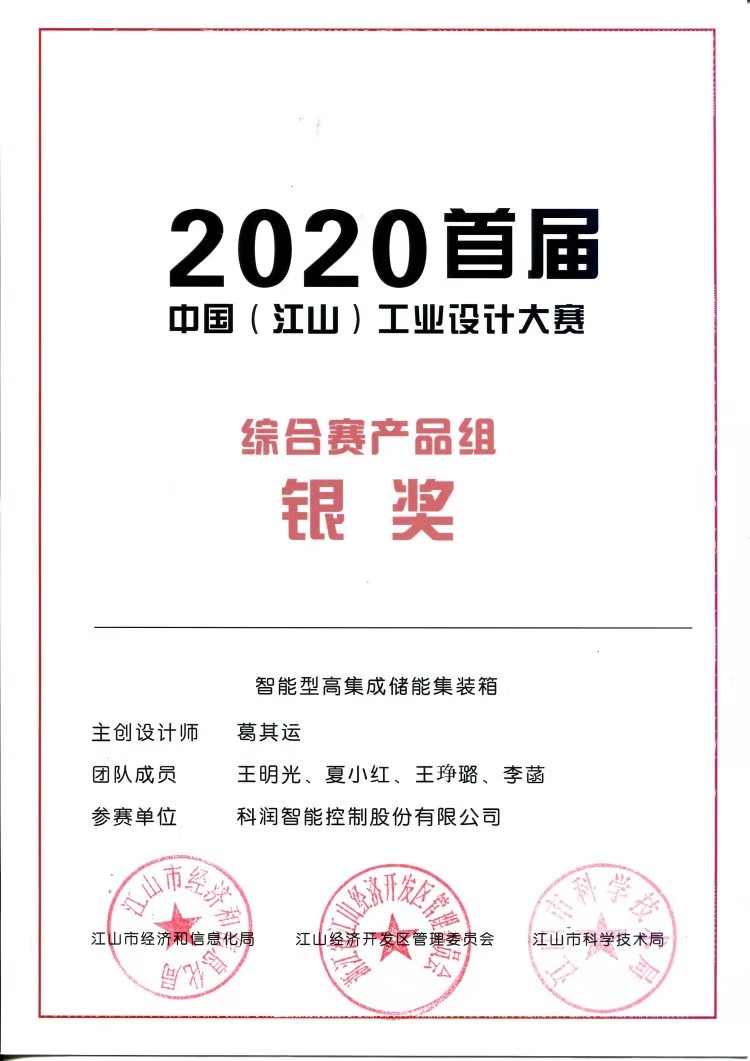 2020年12月25日,2020首屆中國(江山)工業設計大賽決賽暨頒獎典禮在江山東方文華酒店隆重舉行。本次大賽組委會共收到1864件作品,經過初評、復評選出48位(4個小組,每組12名)優秀作品進入決賽,我司生產的智能型高集成儲能集裝箱產品榮獲大賽綜合賽產品組銀獎。